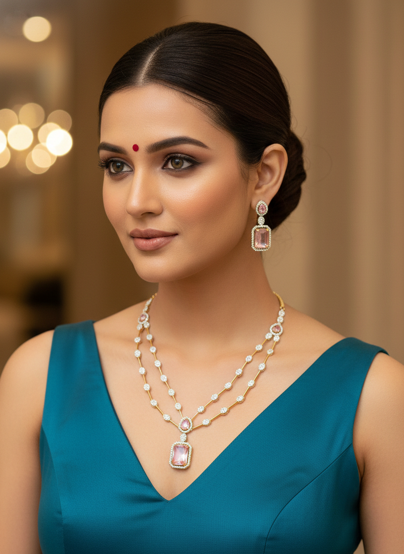 Gold Plated American Diamond Baby Pink Necklace Set Prism Aura