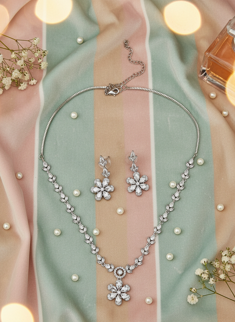 American Diamond Silver-Plated Flower Bloom Necklace Set