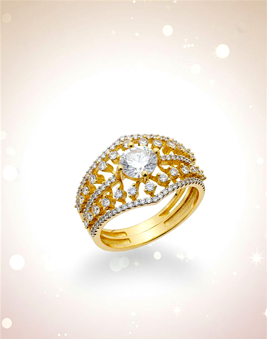 Unveil timeless glamour with the Radiant Aurelia American Diamond Ring. Crafted in high-polish gold finish, this exquisite piece features a brilliant-cut central stone surrounded by a symphony of sparkling crystals in a lattice-inspired design. The openwork detailing enhances the light play, allowing every facet to shimmer with sophistication.